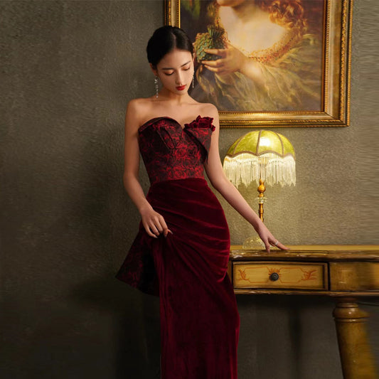 Robe de soirée sirène rétro en velours bordeaux rose, robe fourreau longue de bal 183