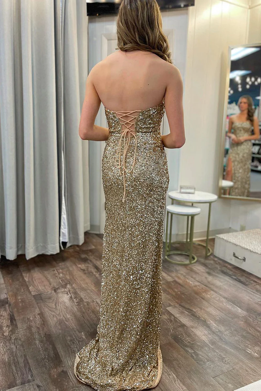 Robe de bal longue bustier à paillettes dorées et fente 2284