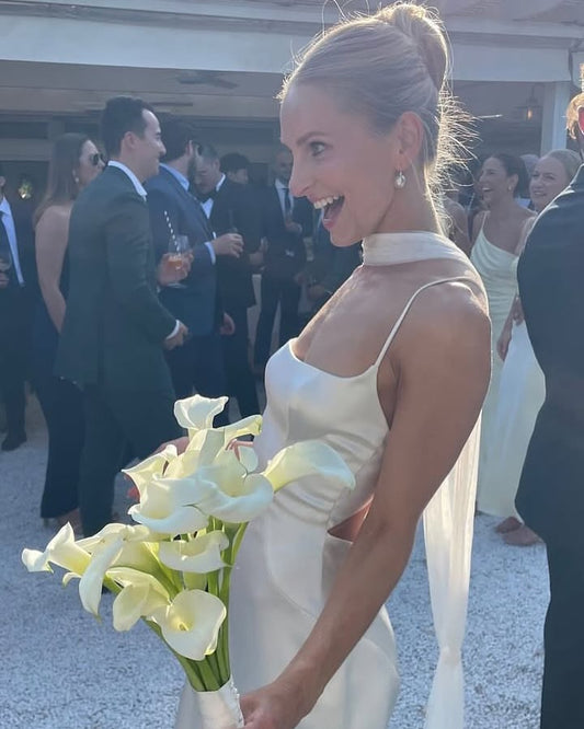 Robe de mariée sirène blanche à bretelles spaghetti en satin J7979