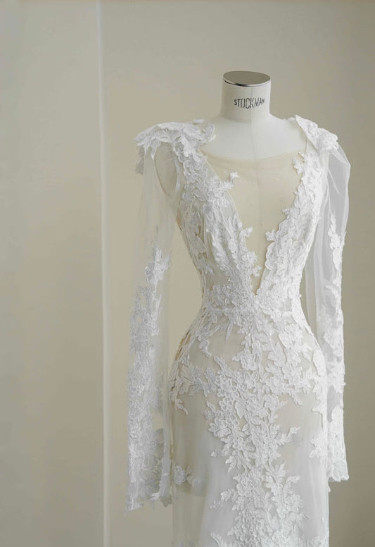 Robe de mariée sirène dos nu en dentelle et manches longues J6602