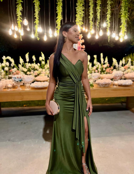 Robe de soirée longue verte à épaules dénudées, robe d'invitée de mariage J8788