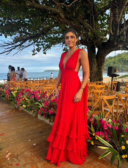 Robe de bal longue orange à volants et col en V pour invitée de mariage 2195
