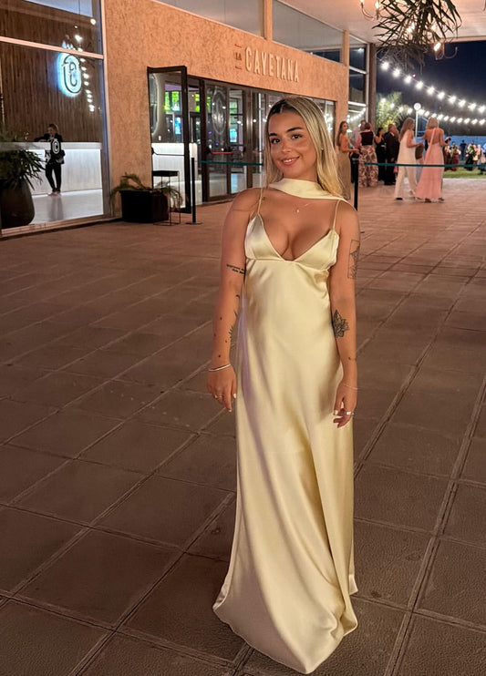 Robe de soirée fourreau fendue en satin jaune pour invité de mariage J6517