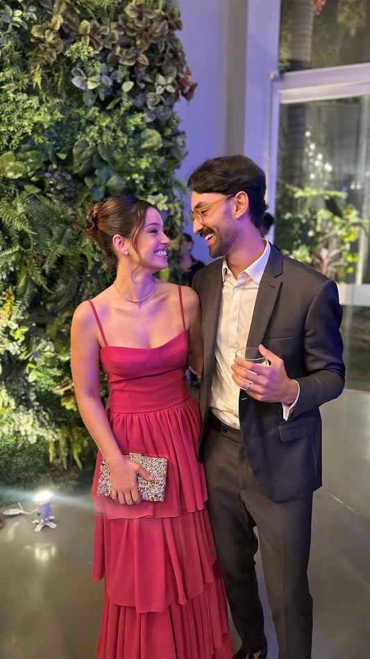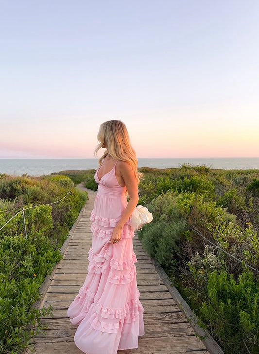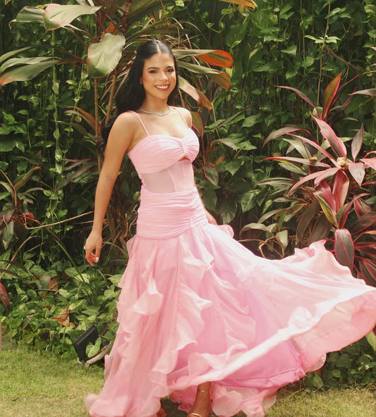 Robe de bal rose à bretelles spaghetti et volants, robe d'invitée de mariage J7773