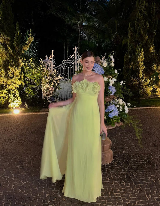 Robe de bal longue bustier coupe trapèze verte en mousseline de soie, robe d'invitée de mariage J5281