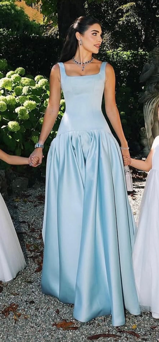 Robe de soirée bleue dos nu pour invité de mariage, coupe trapèze, J7180