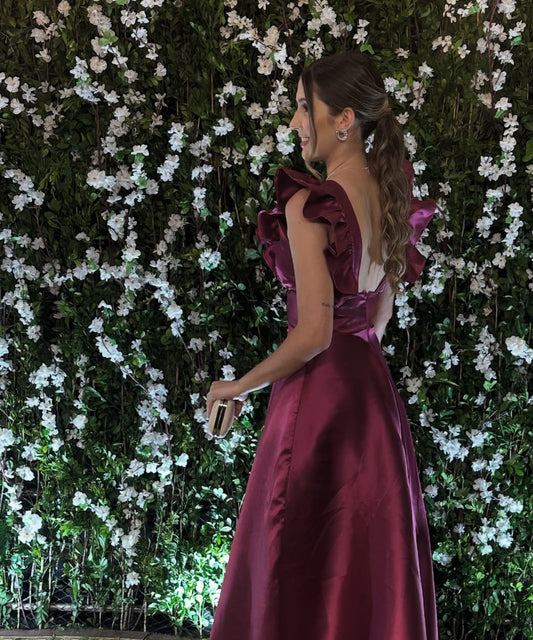 Robe de bal longue en satin fuchsia coupe trapèze, robe d'invitée de mariage J8710