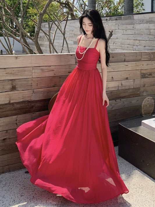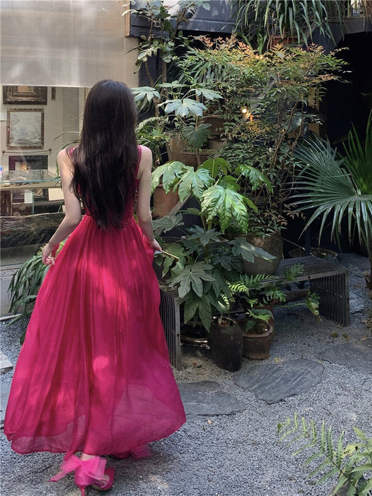 Robe longue plissée en mousseline de soie rouge rose 1909