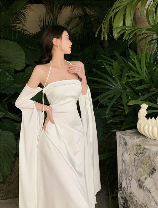 Robe de bal à épaules dénudées et dos nu en satin, robe slim à manches longues 1908