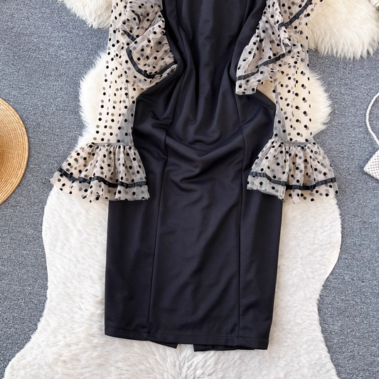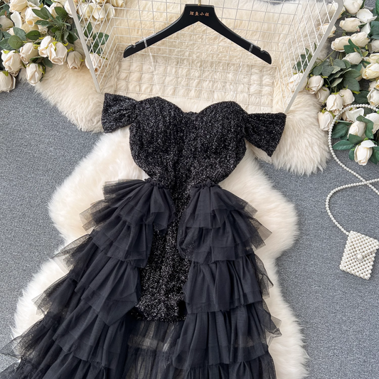 Robe de bal féerique en maille pailletée, robe de soirée noire superposée, 1887