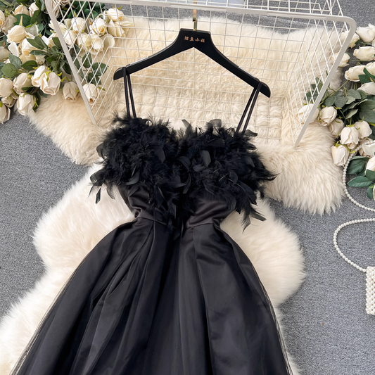 Robe noire rétro en maille plume, robe longue à bretelles spaghetti bouffantes 1884