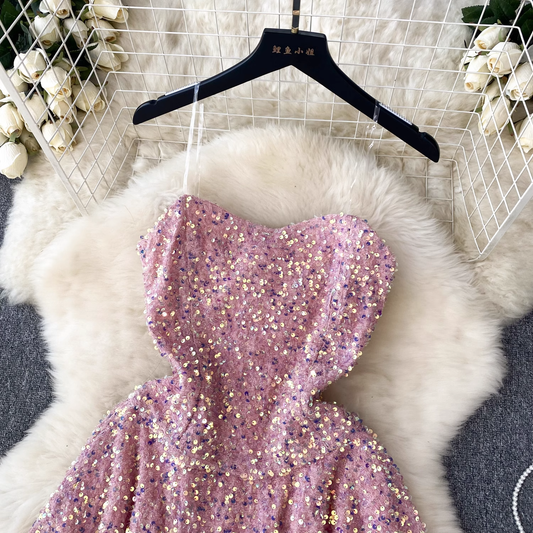 Robe courte à bretelles spaghetti et paillettes roses, robe de soirée 1860