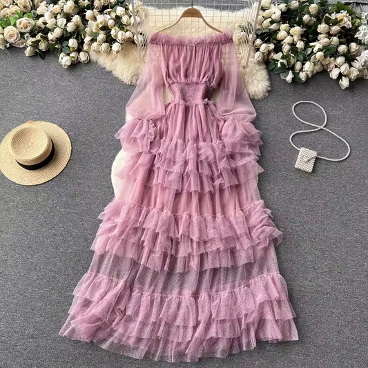 Robe à volants en maille à volants, jupe longue à épaules dénudées, style féerique, 1858