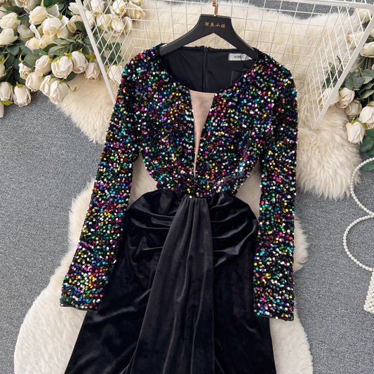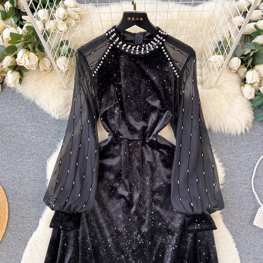 Robe de bal à paillettes et manches longues en velours noir 1864