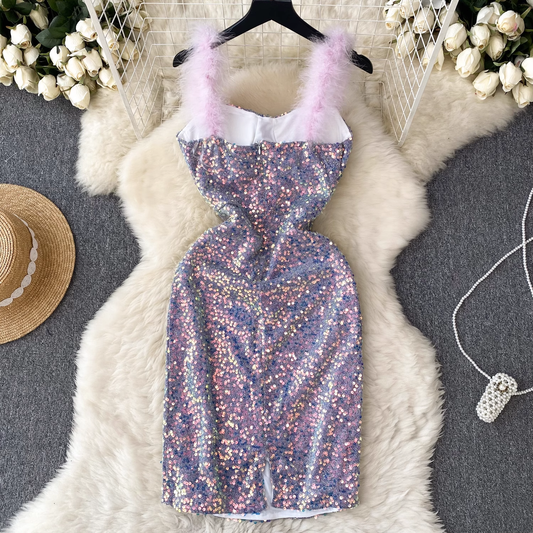 Robe courte violette à paillettes brillantes et bretelles en plumes, robe de soirée 1861