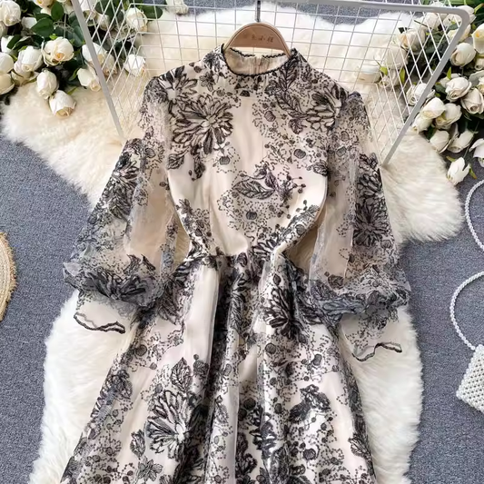 Robe princesse transparente en maille brodée, jupe trapèze à volants français 1851