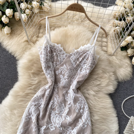 Robe mi-longue sexy à bretelles spaghetti en dentelle, coupe ajustée 1806
