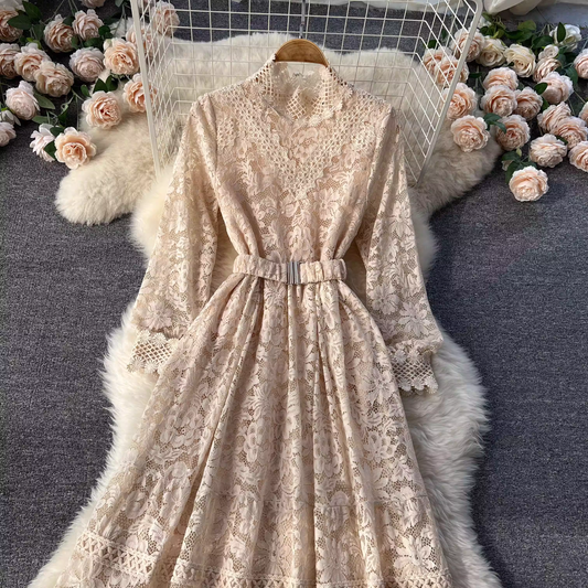 Robe longue brodée en dentelle à col rond, élégante, printemps et automne, 1852