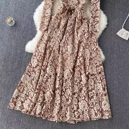 Robe d'automne à col en V et broderies florales en dentelle 1807