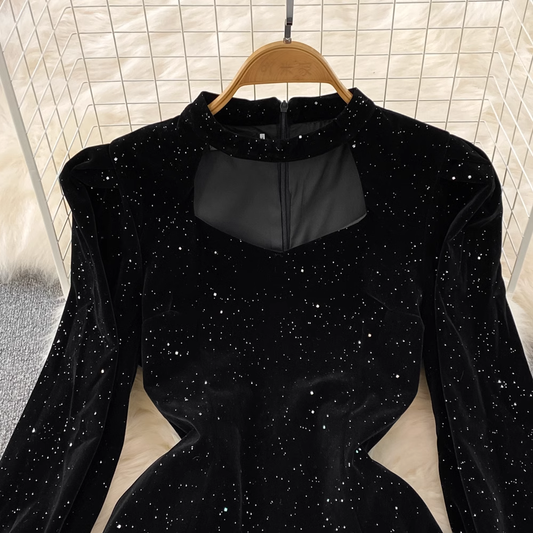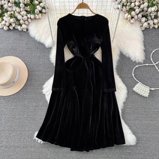 Robe d'automne en velours à manches longues et col rond perlé, robe élégante trapèze 1708