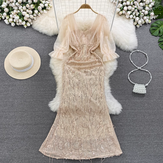 Robe trapèze à volants, manches longues, col rond, dentelle et sequins 1777