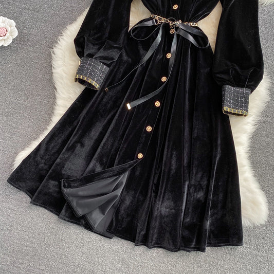 Robe en velours rétro style français d'automne, jupe longue élégante et trapèze 842
