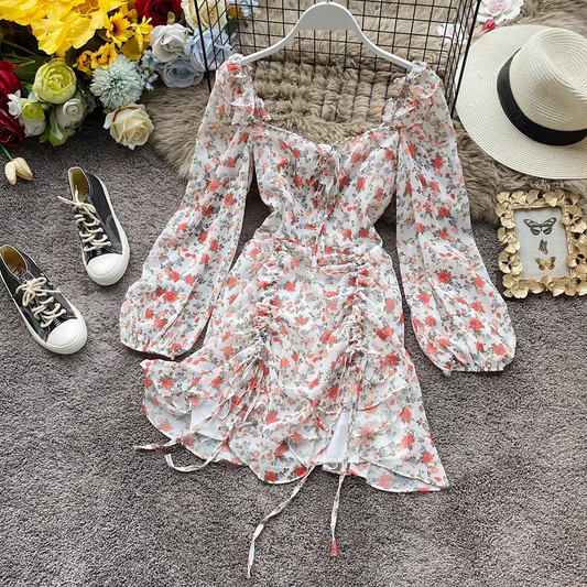 Robe rétro française à col carré et imprimé floral en mousseline de soie 851
