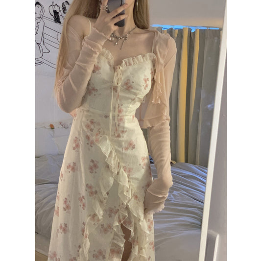 Robe fleurie à bretelles spaghetti, nouvelle jupe mi-longue fendue d'été 827