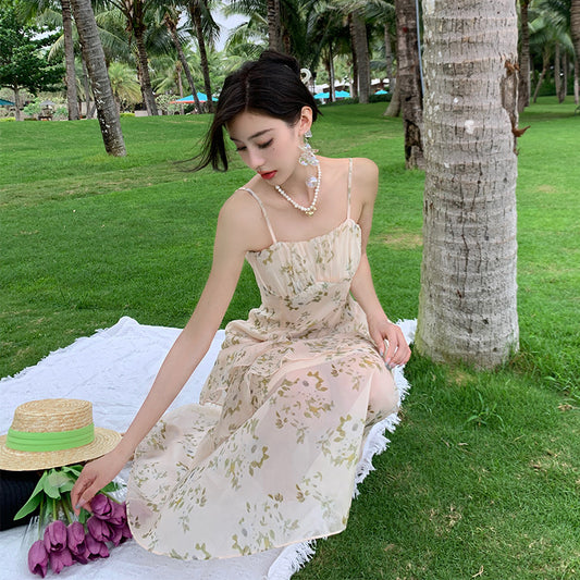 Robe à bretelles spaghetti à fleurs françaises Robe d'été rétro 821
