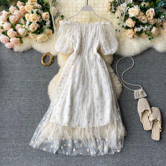 Robe brodée de marguerites mi-longue à manches bouffantes 840