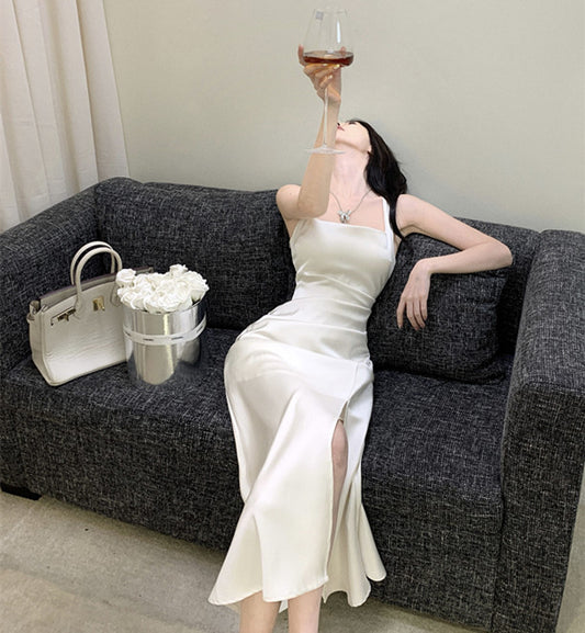 Robe de soirée sexy en satin vintage français avec jupe longue et bretelles spaghetti fendues 781