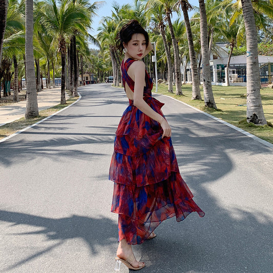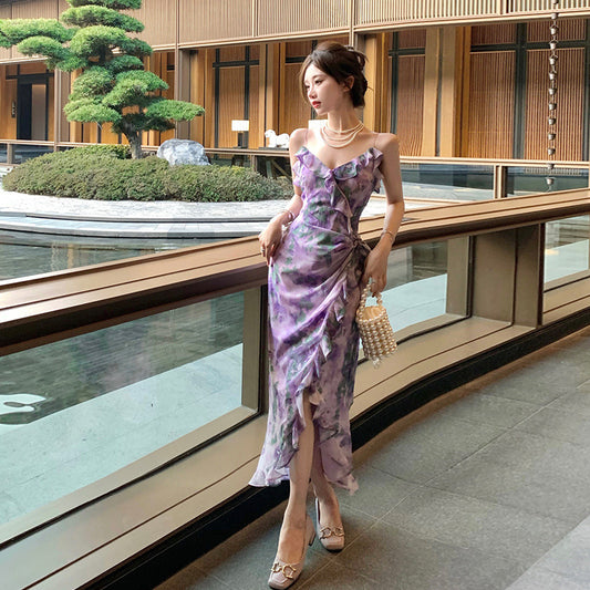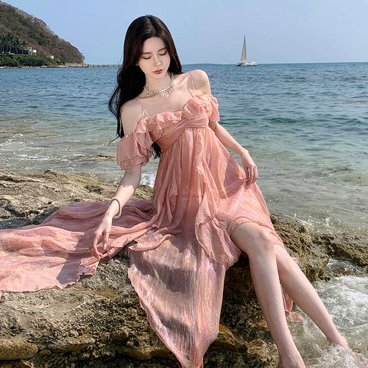 Robe longue à volants style fée française, épaules dénudées, épaules fines, été 786