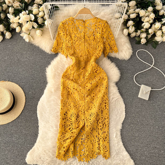 Robe mi-longue sexy à col en V et manches courtes en dentelle découpée 489