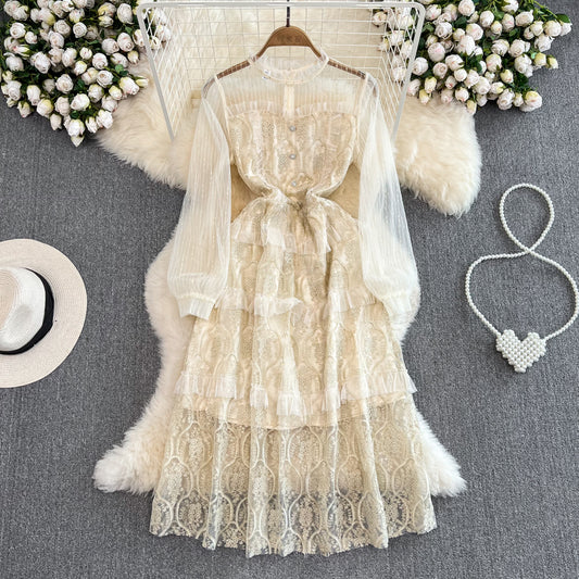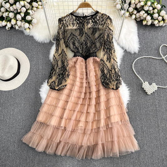 Robe trapèze en dentelle à col rond et maille style rétro français 487
