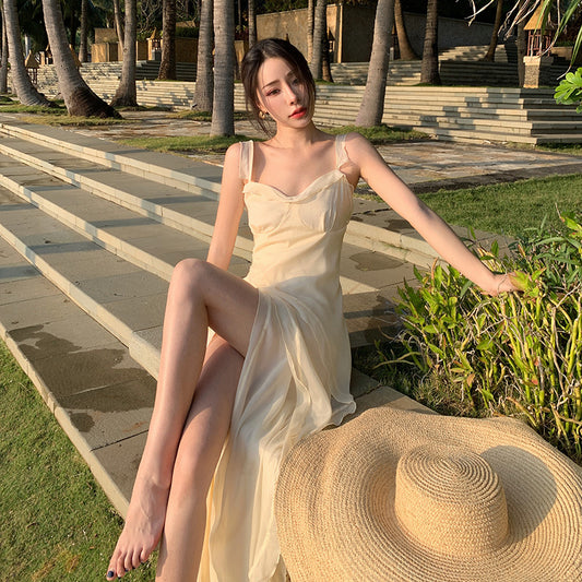 Robe longue à col en V pour femme, volants français, jupe à bretelles spaghetti fendue féerique 507
