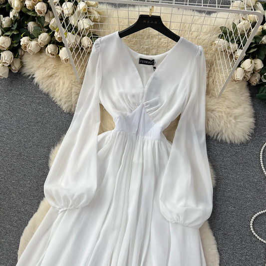 Robe féerique blanche en maille pour femme, col en V, manches lanternes, tulle, grande taille, 478
