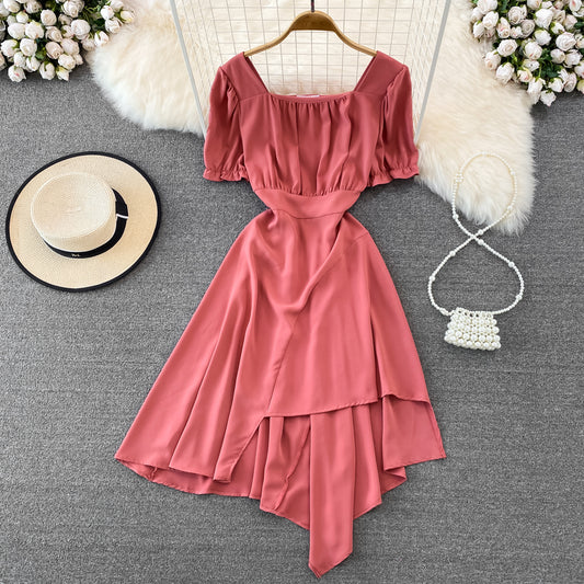 Robe d'été rétro française à manches courtes et coupe trapèze irrégulière pour femme 468