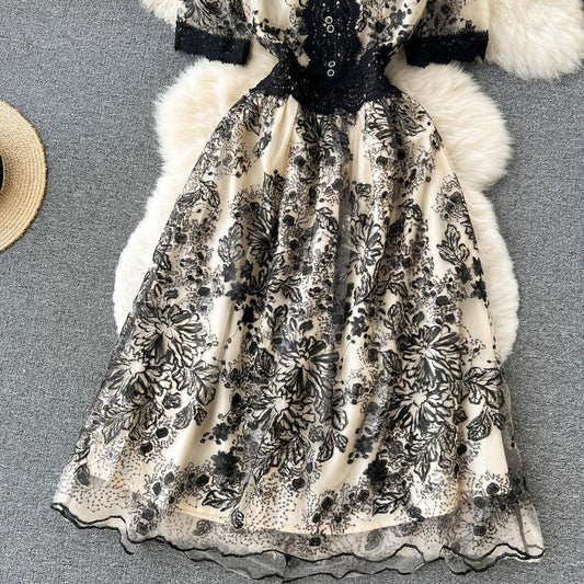 Robe mi-longue à col en V et broderies en dentelle style rétro français pour femme, jupe trapèze ample et ample, 466