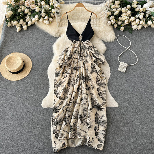 Robe longue à bretelles spaghetti et col en V pour femme, style rétro français, 465