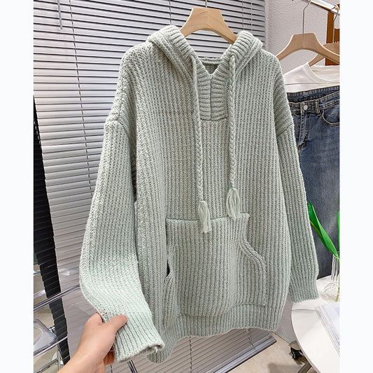 Pull épais à capuche pour femme, pull ample mi-long en tricot, idéal pour l'automne et l'hiver, 725