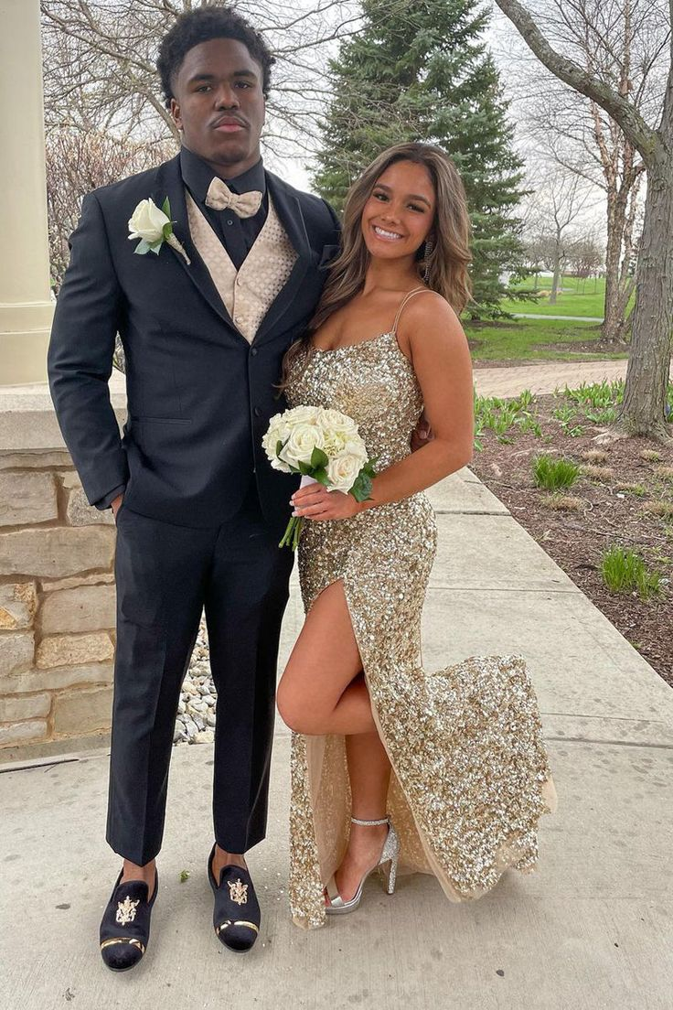 Robe de bal longue sirène à paillettes dorées et fente J2571