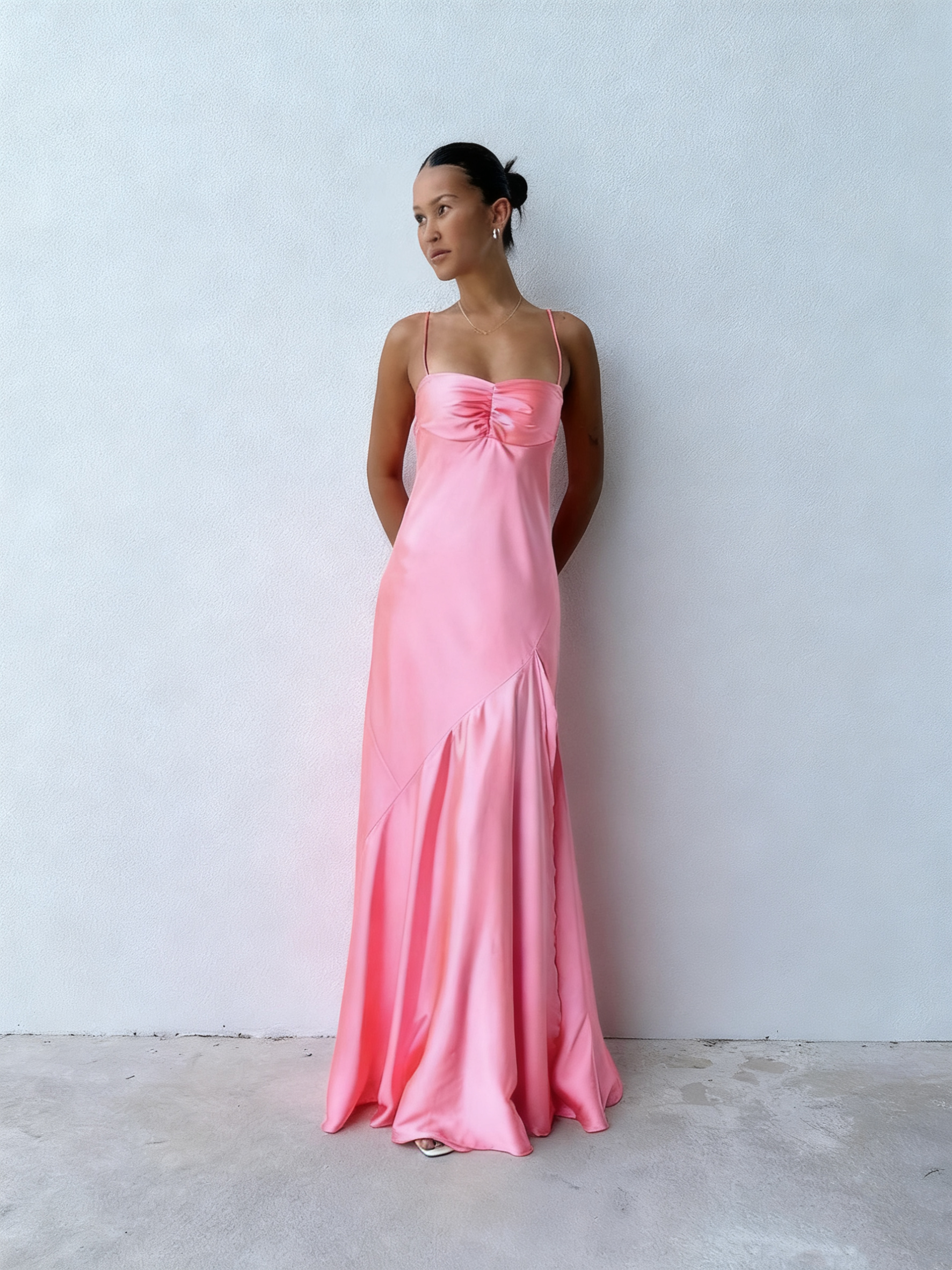 Robe de bal longue pêche en satin, coupe trapèze, modèle J3146