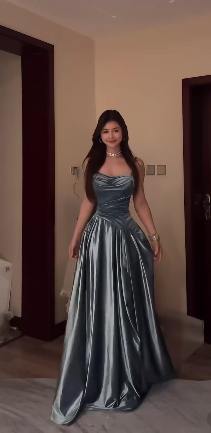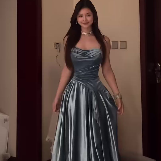 Robe de bal trapèze à bretelles spaghetti, gris et bleu, en satin, tenue d'anniversaire, J6612