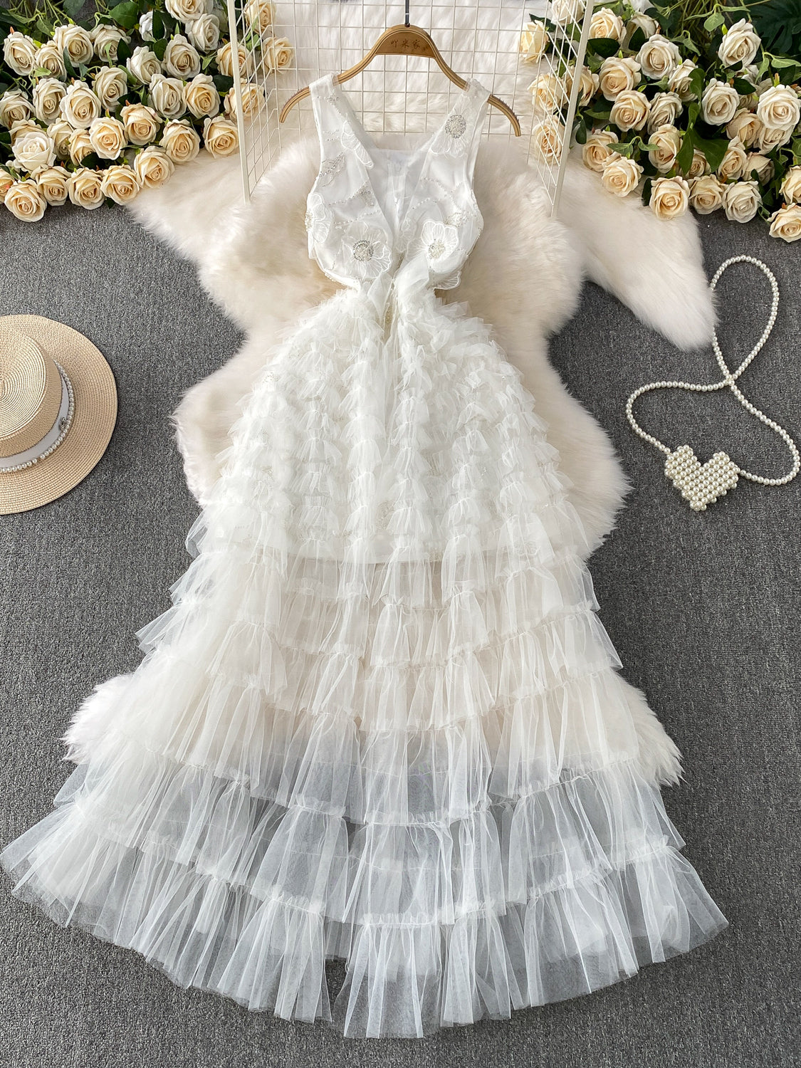 Beaded Sequined V-Neck Sleeveless Dress Princess Mesh Cake Maxi Dress L51