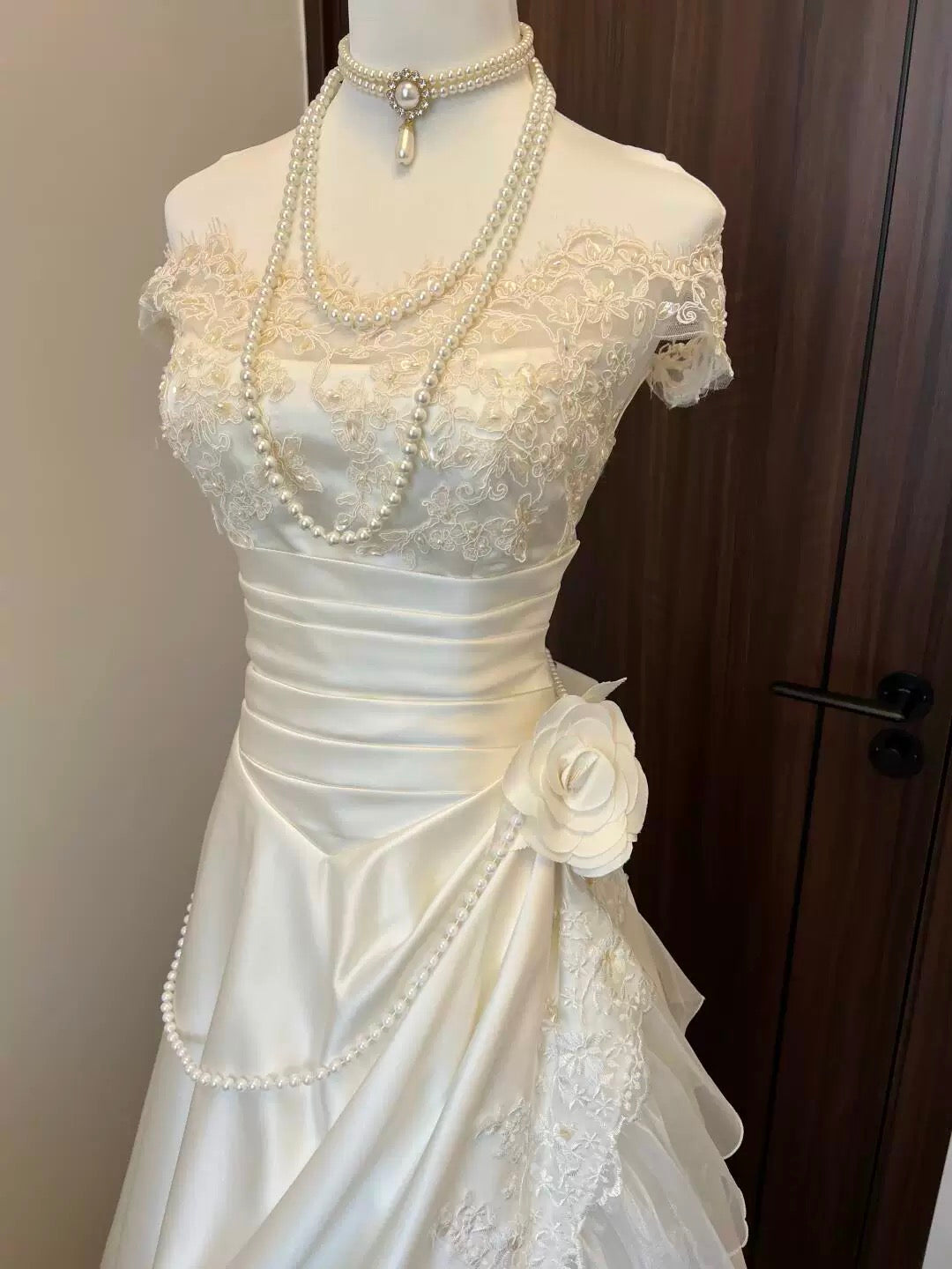 Off Shoulder A Line White Wedding Dress Applique Bridal Dress J7725
