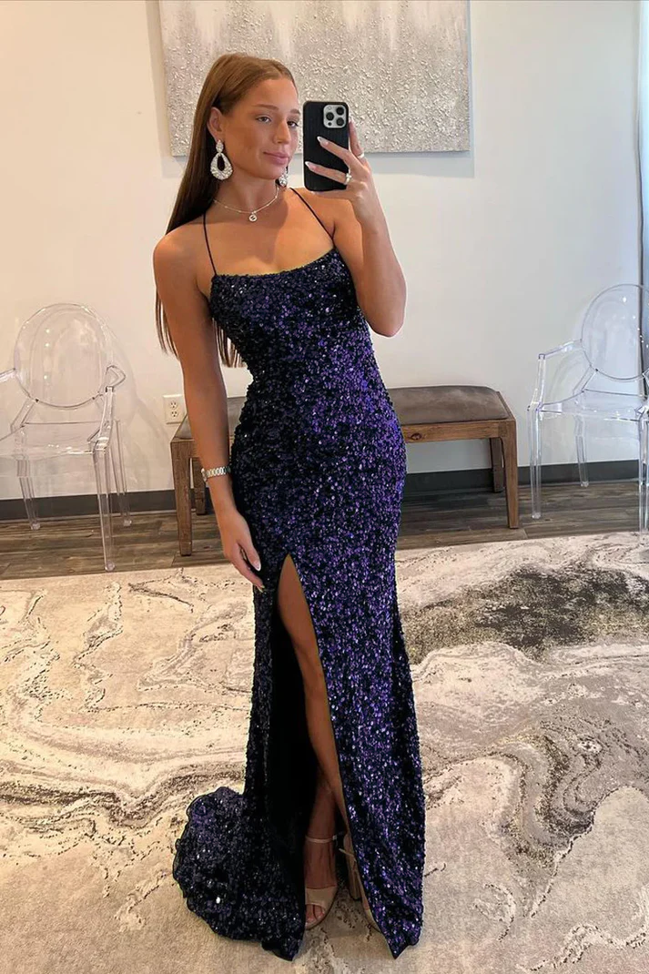 Navy Blue Sequin Sheath Long Prom Dresses Lace Up Back Evening Gown 2281