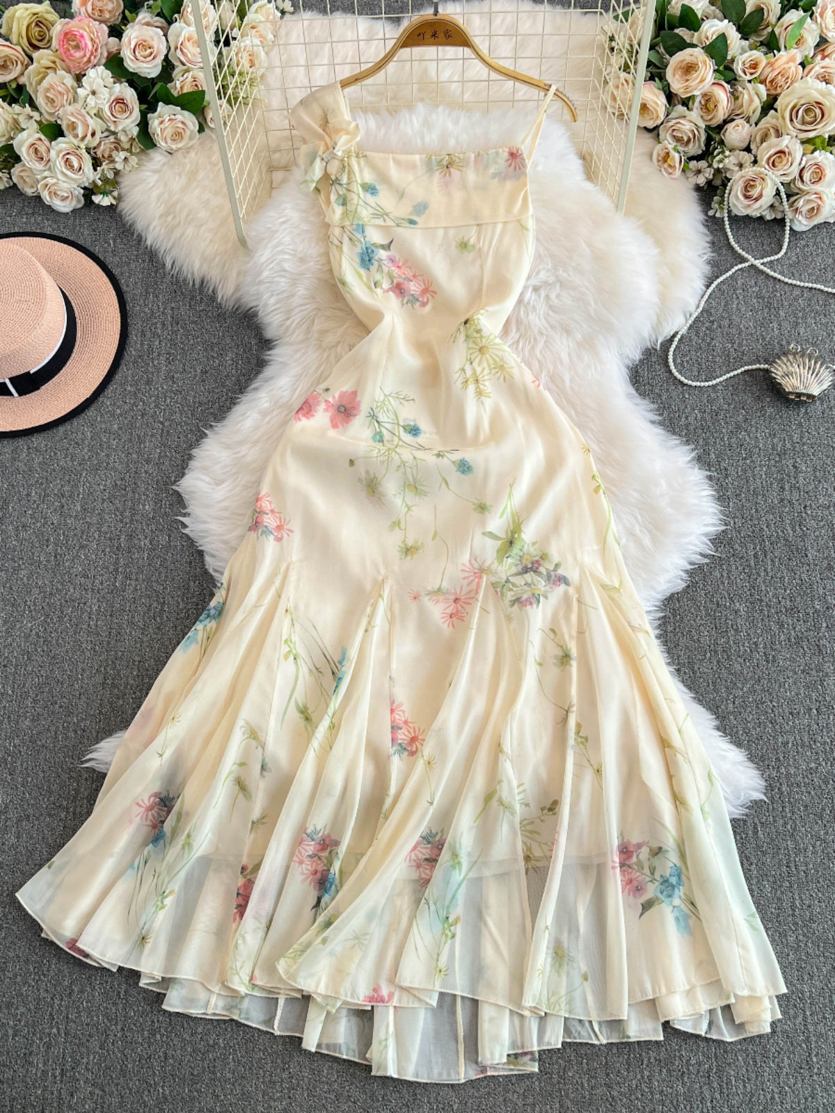 Spaghetti Strap Floral Apricot Dress Summer Chiffon Long Skirt L61