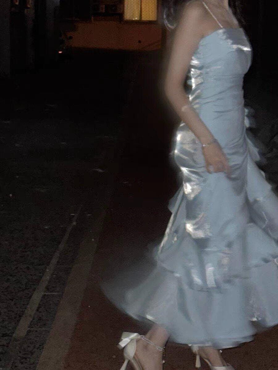 Spaghetti Straps Sheath Light Blue Prom Dress Formal Satin Party Dress 2492