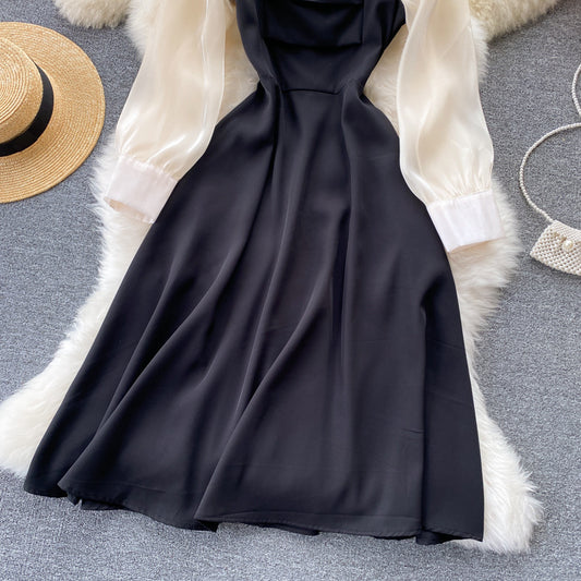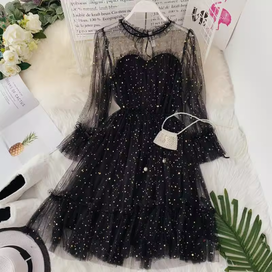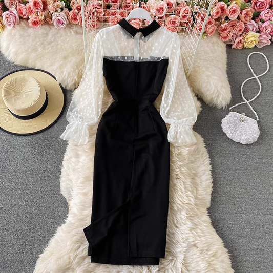 Summer New Tulle Sheath Dress Black Long Sleeves Elegant Dress 865