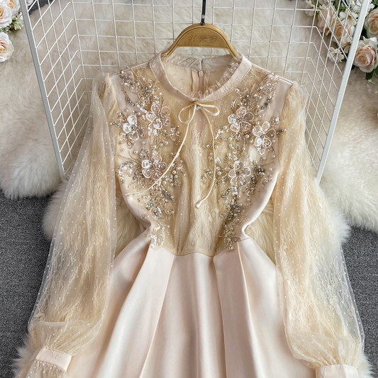 Retro Bubble Long Sleeve Mesh Skirt Beaded A-Line Dress 928